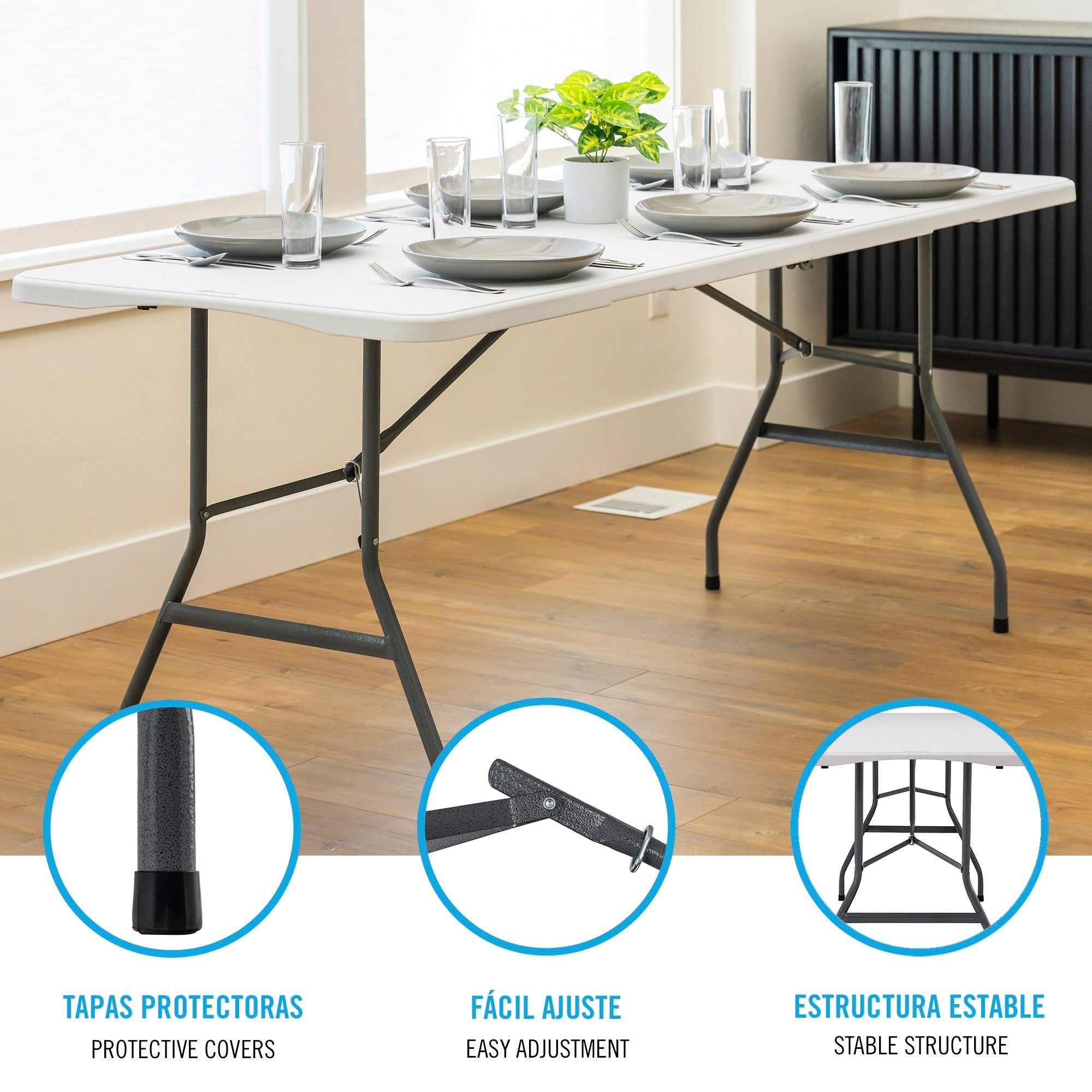 Esta versátil mesa rectangular con tablero plegable por la mitad, patas abatibles y tablero con refuerzo de acero es la solución perfecta para cubrir la falta de espacio en cualquier acontecimiento. Un mueble multifuncional y práctico que se adaptará tanto a necesidades personales como de uso comercial.