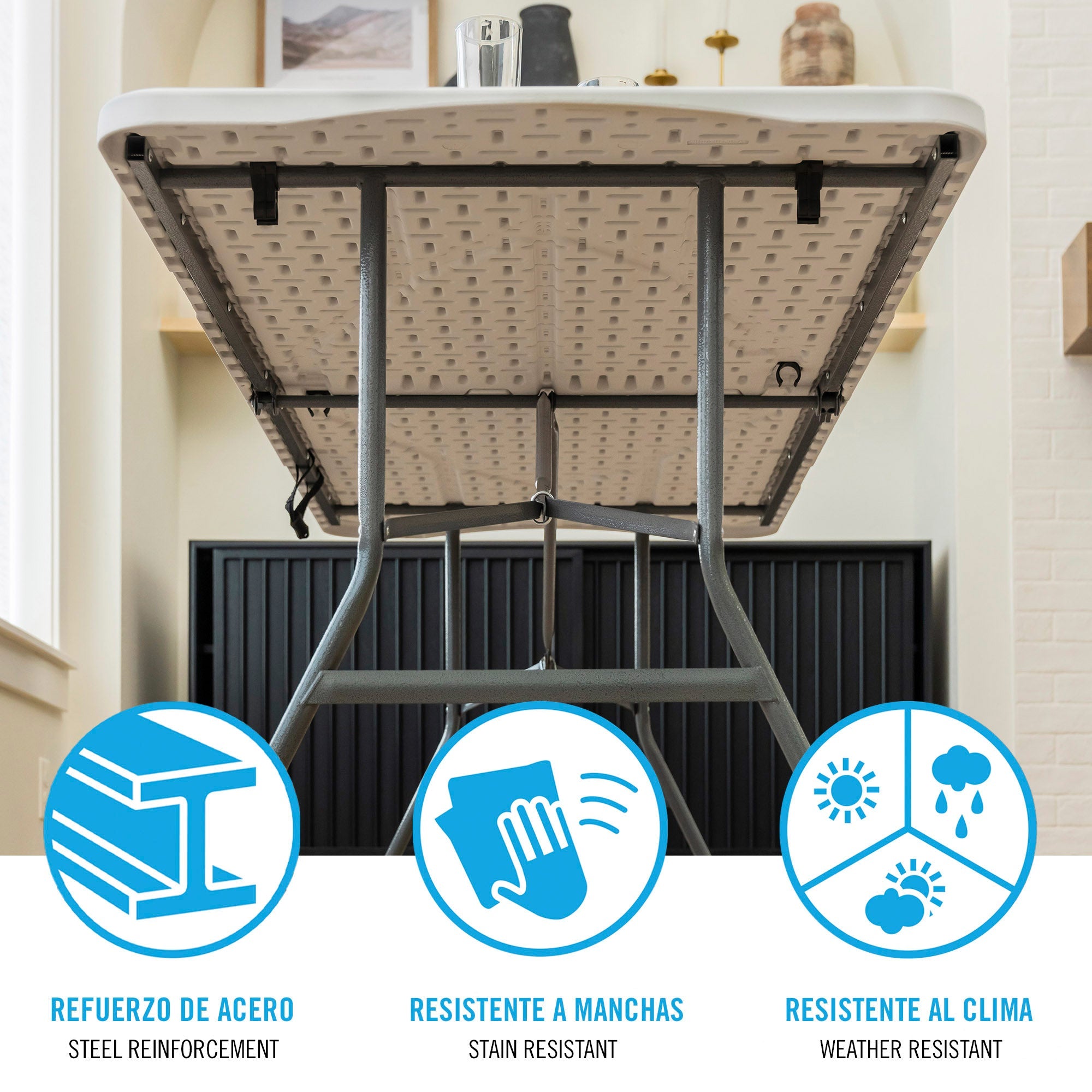 Pliega sus patas dentro del tablero para guardarla sin apenas ocupar espacio o transpórtala cómodamente gracias a su asa integrada y su construcción ultraligera. Una mesa resistente y duradera de bajo mantenimiento, ideal para disfrutar de eventos y reuniones tanto en exterior como en interior.